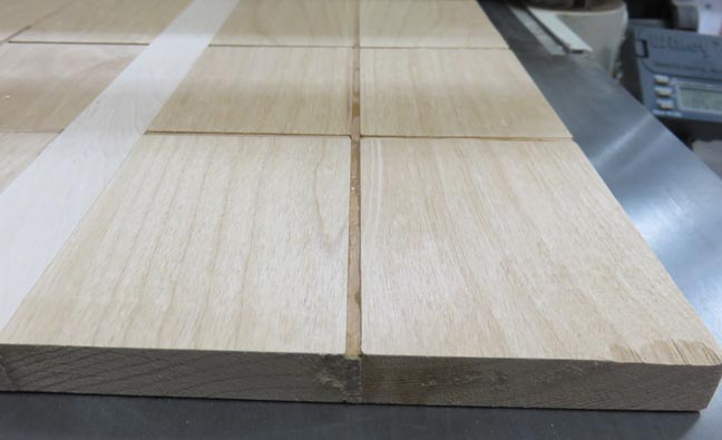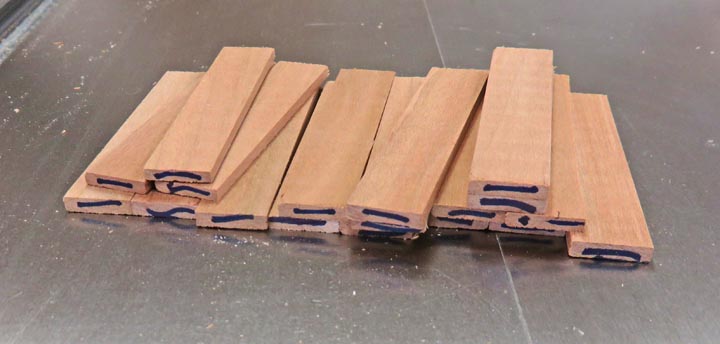 Here are the cherry pieces that will separate the rectangle pieces. The marks on the ends are so I know which ones have been cut. Just an easy way for me to keep track.