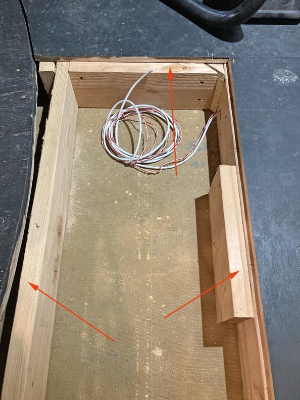 Here we've added some 2" X 6" pieces to fasten the floor to (arrows).